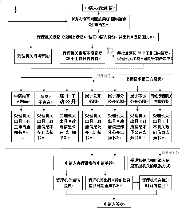 對申請人提出的政府信息公開申請,本機關將根據不同情況分別作出答復。能夠當場答復的,將當場答復;不能當場答復的,自收到申請之日起20個工作日內予以答復;確需延長答復期限的,延長答復時間不超過20個工作日,并告知申請人。《條例》另有規定的,從其規定。