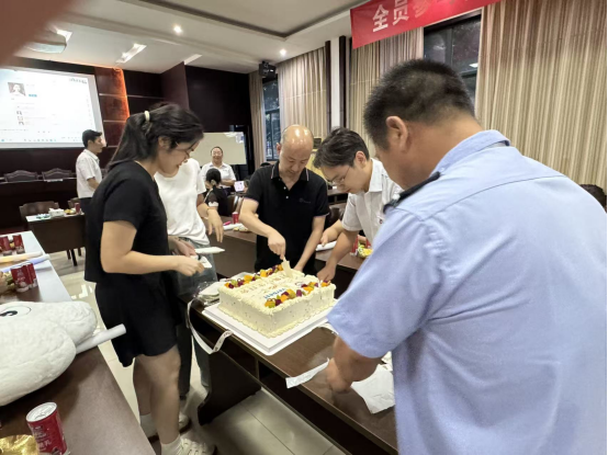在溫馨的氛圍中,大家圍聚在蛋糕前,共同唱響生日歌。歌聲悠揚,傳遞著對壽星們最誠摯的祝福。壽星們閉上眼睛,雙手合十,許下了美好的心愿。那一刻,時間仿佛靜止,整個會場充滿了溫暖與感動。隨后,現場的主管們將一份份生日蛋糕分發到各位壽星手上,大家品嘗著甜蜜的蛋糕,分享著此刻的喜悅,幸福的味道在舌尖蔓延。