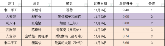 經過兩場激烈的角逐,“永佳杯”歌唱比賽的最終排名終于揭曉!在萬眾期待中,制二手工線李朝坤憑借其醇厚動人的嗓音和出色的舞臺表現力摘得桂冠,由常務副總黃總為其頒發了獎狀及獎金;人資部鄢桂香、制八課張啟娟獲得亞軍,由模具部部長馮文均為其頒發了獎狀及獎金;品質部陳曉玲、人資部宣枝怡和周鈺洋、制二手工顏昌俊贏得了季軍的榮譽,由財務部部部長張金平為其頒發了獎狀及獎金。